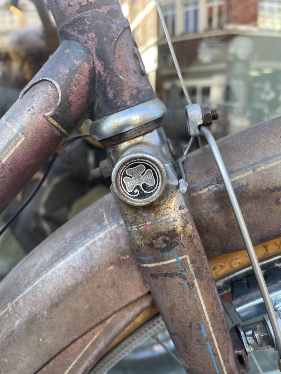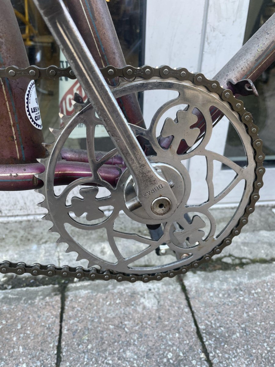 Un vélo qui est bien pour tous ses détails esthétiques : le trèfle sur la fourche et le pédalier, et ses énormes garde-boue.