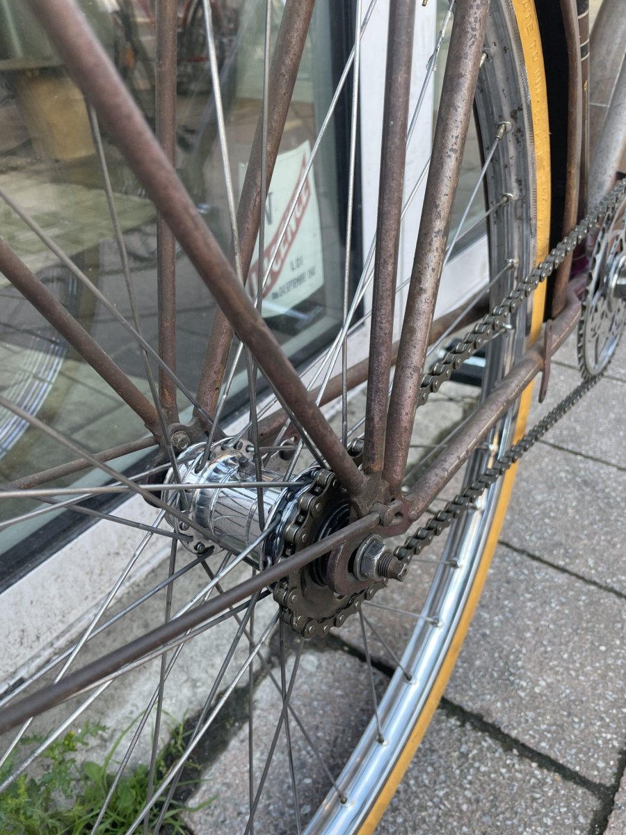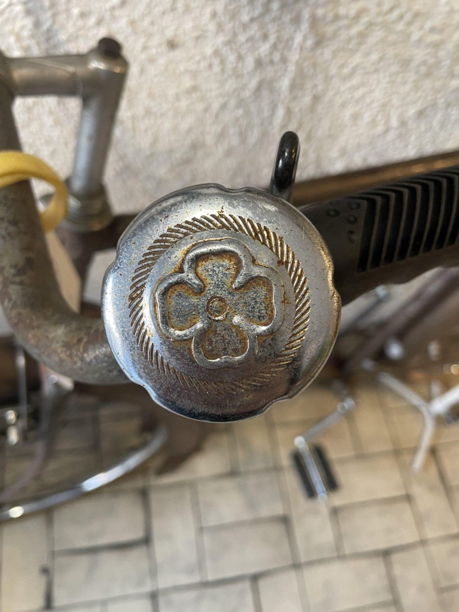 Manque malheureusement deux ou trois pièces d’origine qui feraient de lui un vélo parfait pour rouler d’origine : principalement le phare av et le carter de protection chaîne.