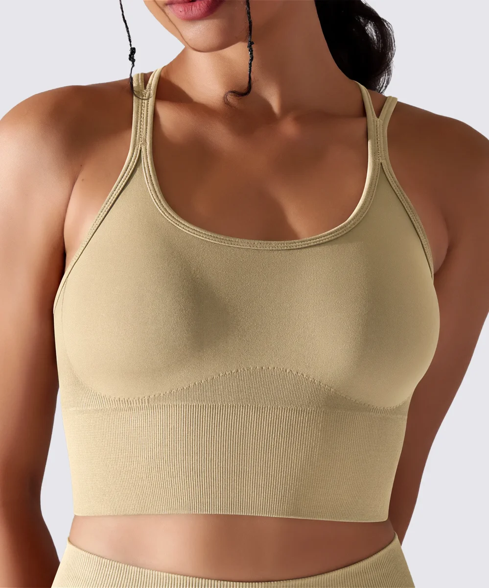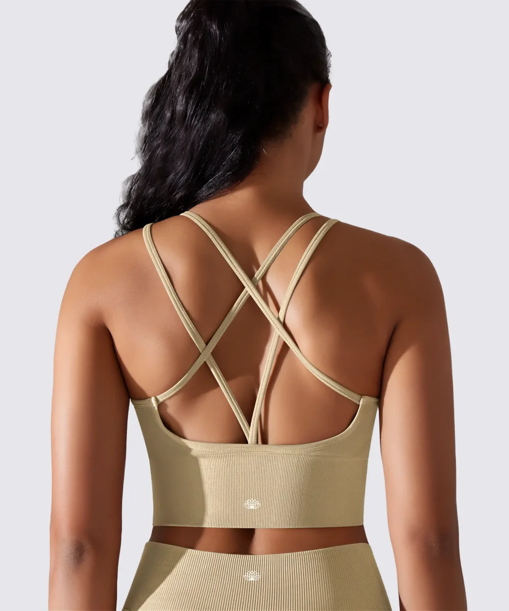Alliant maintien et élégance, cette brassière de sport beige Serenity garantit confort et liberté de mouvement. Son dos croisé raffiné assure un soutien parfait, tandis que sa matière respirante et extensible épouse chaque mouvement pour un flow fluide du yoga au fitness.