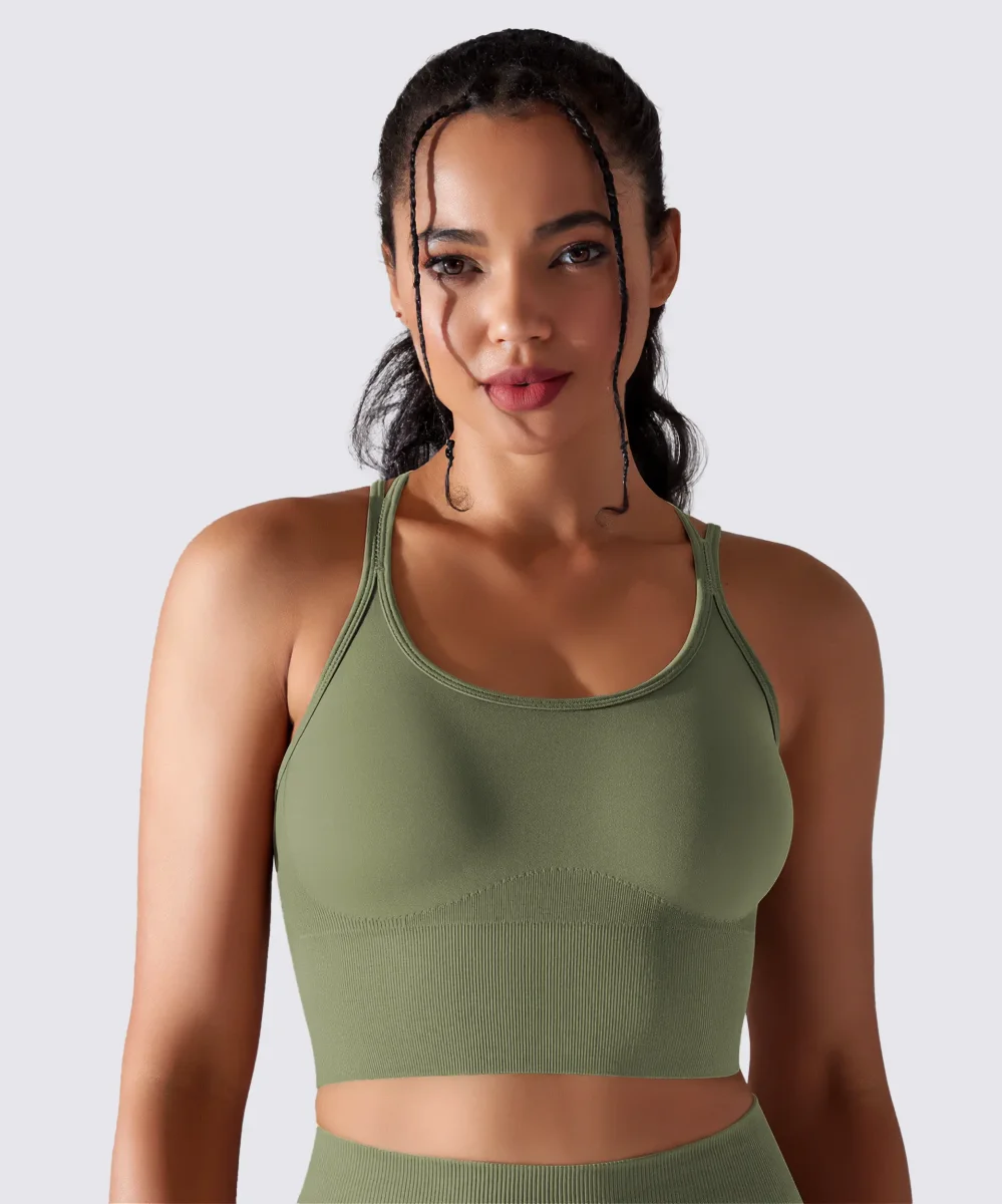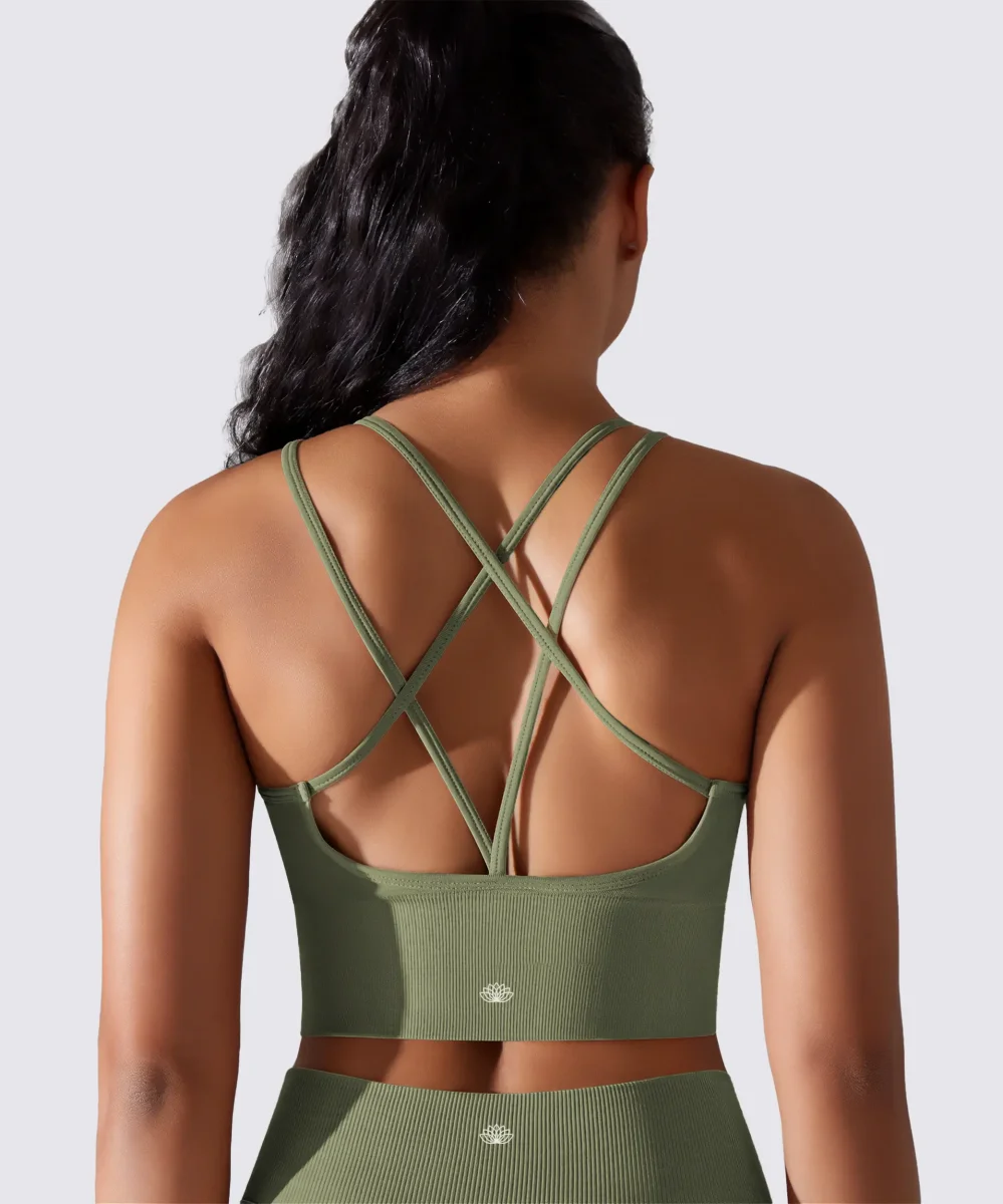 La brassière de sport kaki olive Serenity évoque l’équilibre entre nature et performance. Conçue pour un maintien optimal, elle accompagne vos mouvements avec confort et liberté. Son dos croisé élégant et sa matière respirante offrent un soutien parfait, du yoga au fitness.