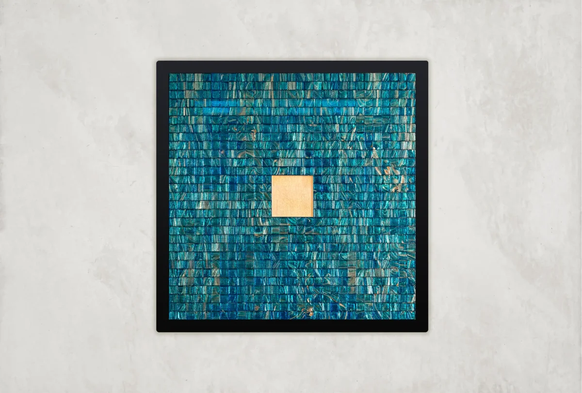 Un hommage aux origines liquides de notre monde. Dans ce tableau bleu intense, chaque tesselle capture un éclat du grand océan primitif, là où la vie est apparue, portée par la lumière et le mouvement. Au centre, un carré d’or symbolise le miracle : l’étincelle, le battement initial. Les nuances abyssales, entre turquoise, cobalt et reflets dorés, créent une vibration méditative — comme si l’océan lui-même retenait son souffle.