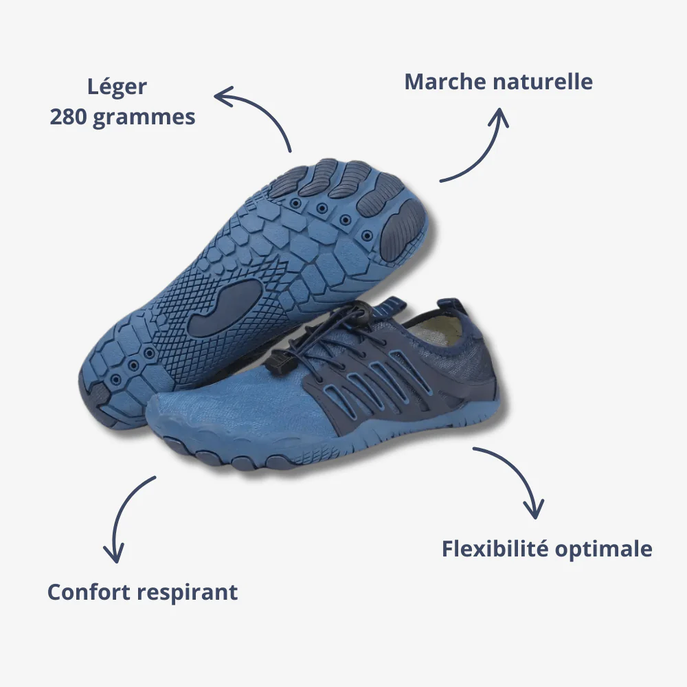 - Large espace au niveau des orteils : Favorise l’équilibre et réduit la pression exercée sur l’avant-pied.