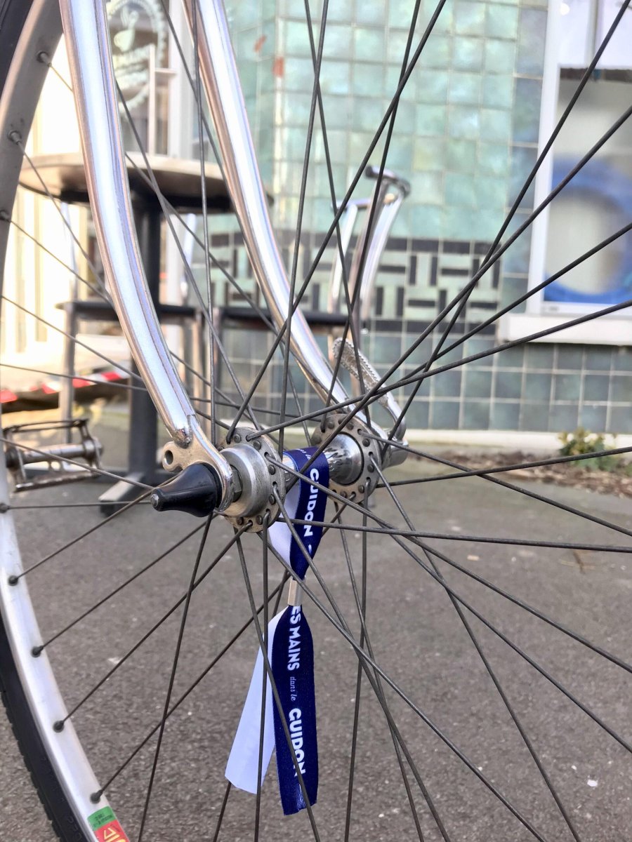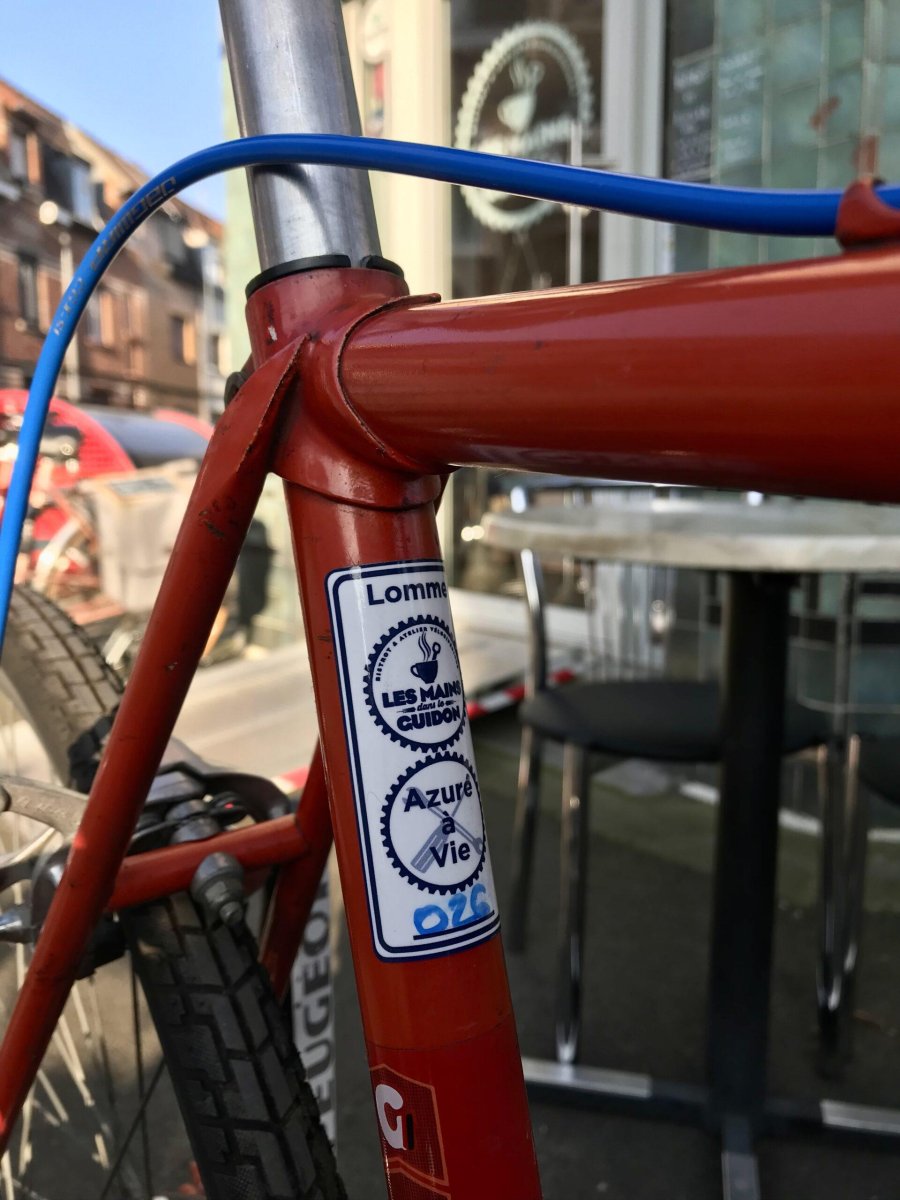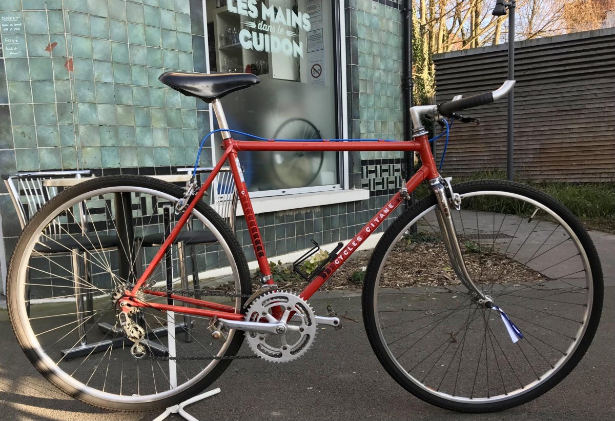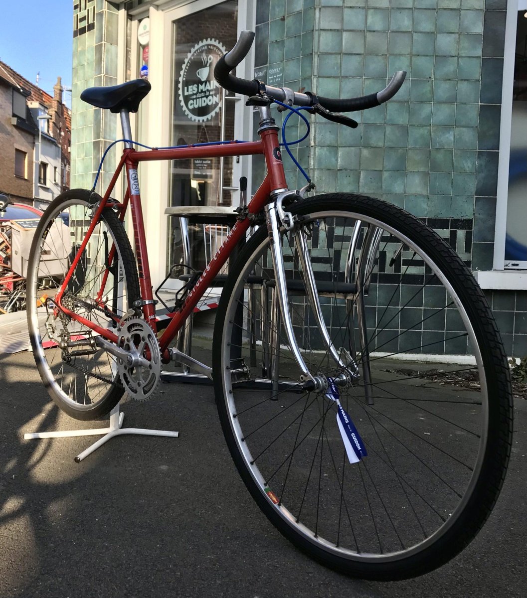 Roue 28″ avec moyeux SACH et PELISSIER Pneus 37-622 2X5 vitesses commandes au cadre SIMPLEX DĂ©railleur AV et AR SIMPLEX Etriers de frein MAFAC Levier de frein fixie Cintre corne bull