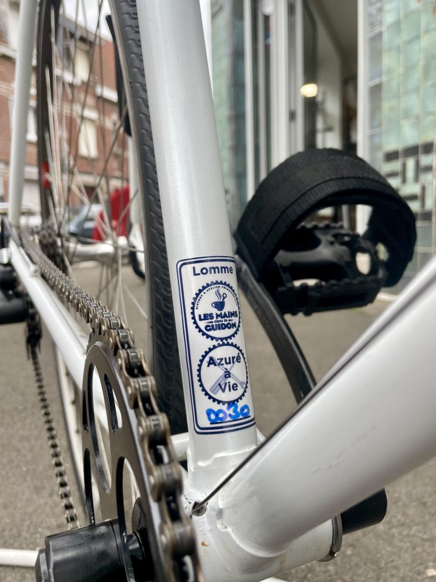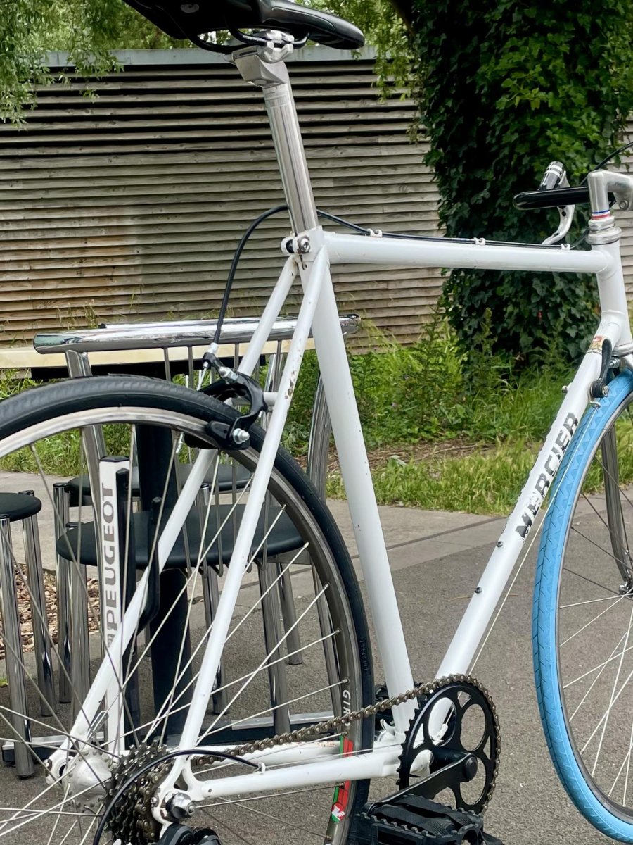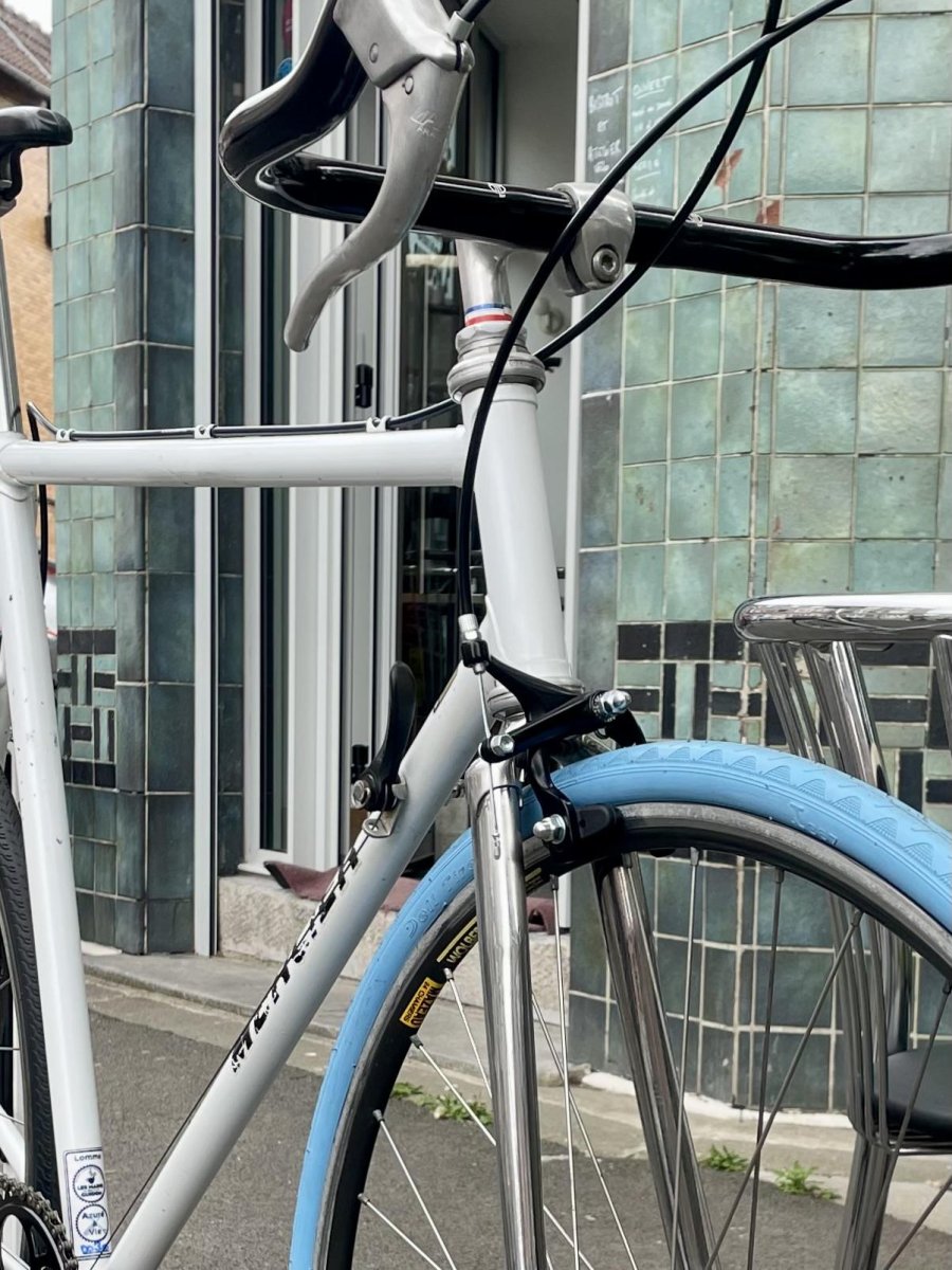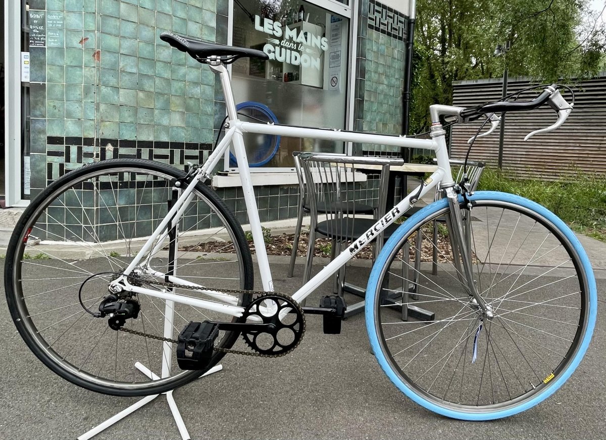 Cadre COLUMBUS Roue 28″ avec moyeux  MAVIC et CAMPAGNOLO Pneus 28-622 6 vitesses commandes au cadre DĂ©railleur BITWIN Etriers de frein caliper Levier de frein MAFAC Cintre corne bull BLB Selle SELLE ITALIA Cale pied
