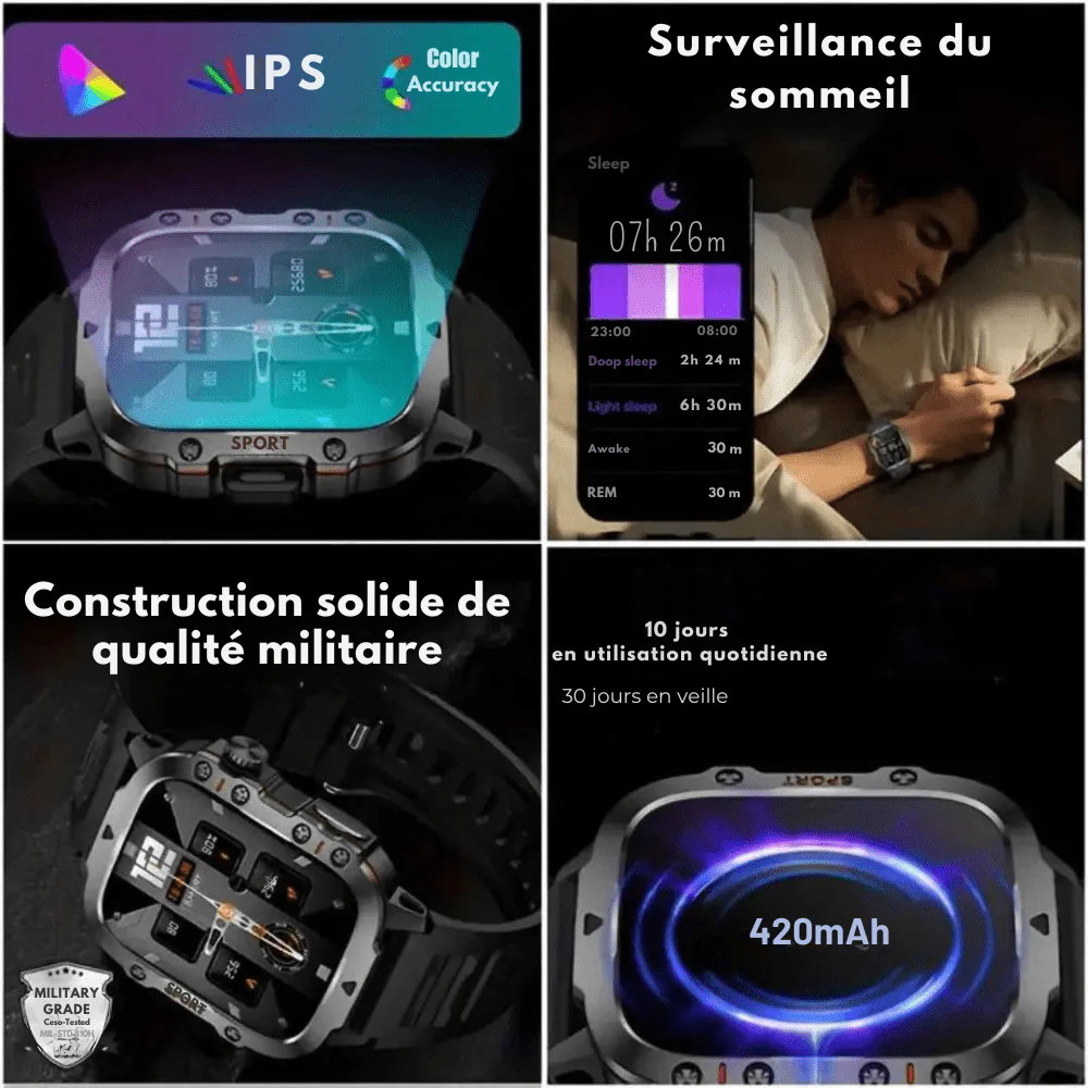 - Fonctions santé : suivi de la fréquence cardiaque, tension artérielle, oxygène sanguin, sommeil