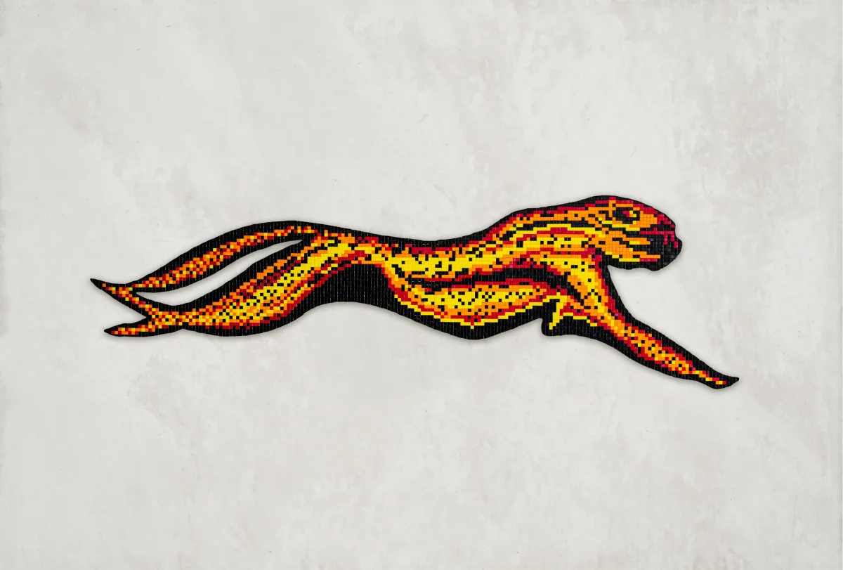Vue de loin, une force en mouvement. De près, une constellation de pixels vivants. Ce guépard vibrant pousse le regard à danser, entre perception immédiate et illusion sensorielle. L’art devient sensation.