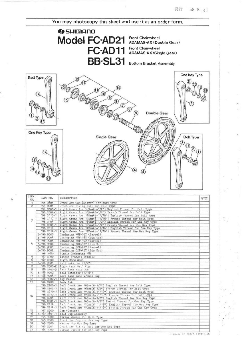 références shimano vis auto-extractante Motobecane Shimano “one key) “165 0600”, “165 0700”, “165 0801”, “165 1000”,