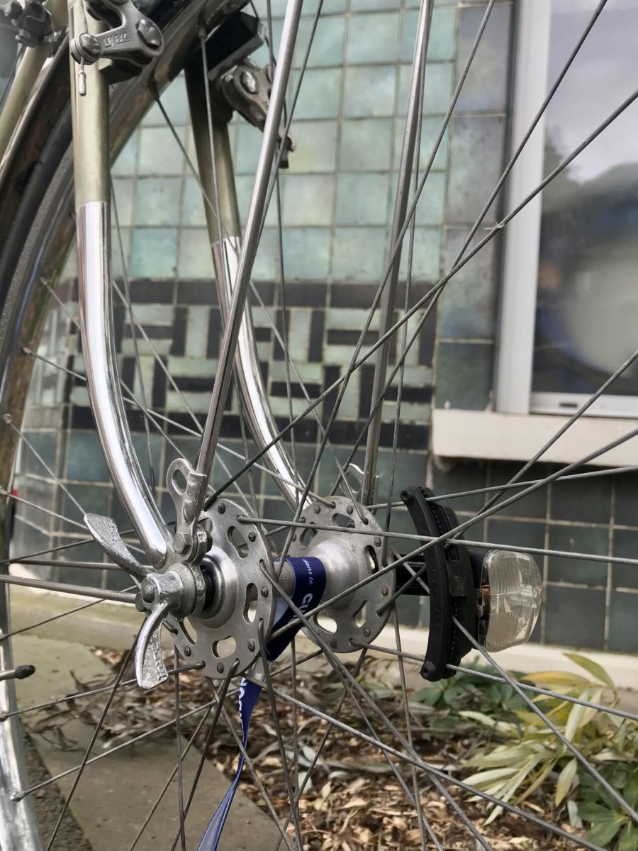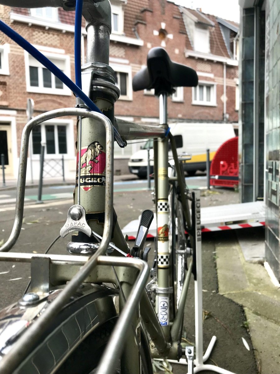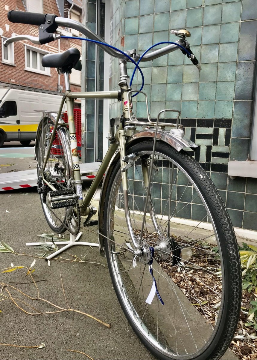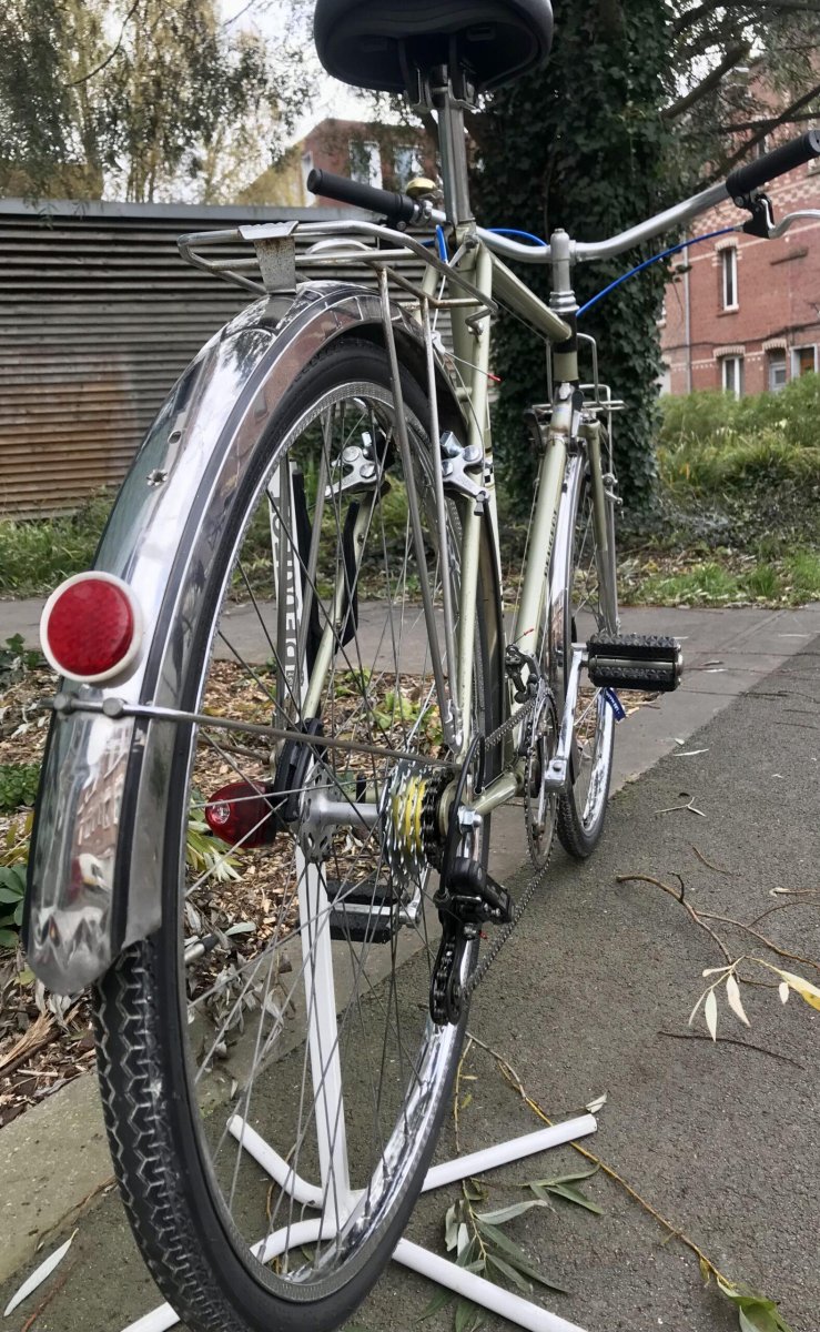 Roue Ă flasque NORMANDY Pneu 35-584 MICHELIN Etriers de frein MAFAC cantilever Vitesses 2×5 SIMPLEX Eclairage REELIGHT aimants (ni pile et ni recharge) Garde boue AV et AR Porte-bagage AV et AR Sonnette