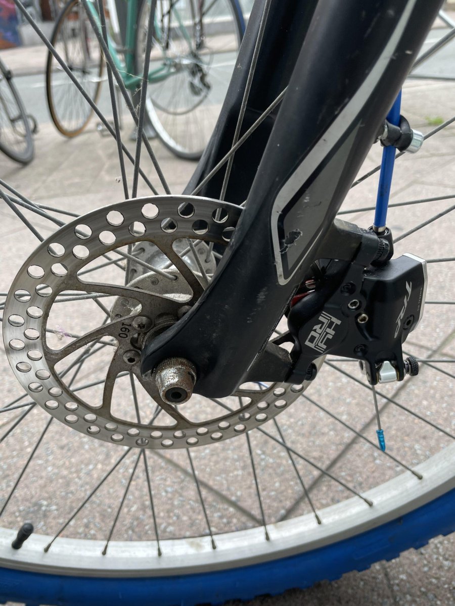 Fourche avant suspendue avec frein à disque et étrier hybride méca/hydro