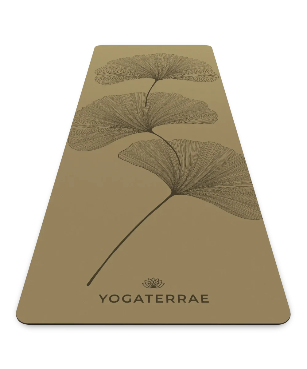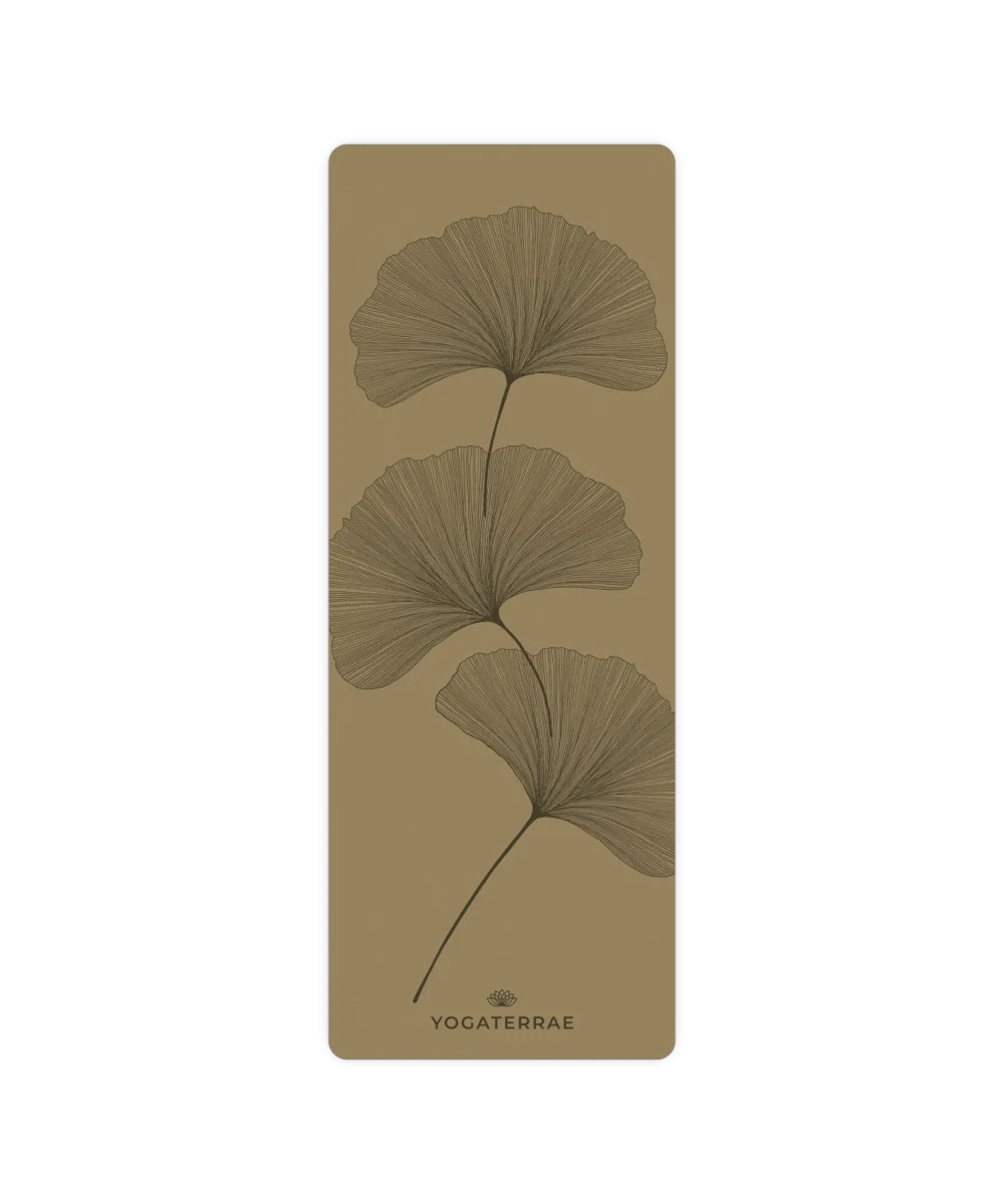 Ce tapis haut de gamme allie une base en caoutchouc naturel à une surface en PU bronze olive élégante et ultra-adhérente. Son motif Ginkgos en ton sur ton offre une présence subtile et profonde, idéale pour des pratiques ancrées et méditatives.