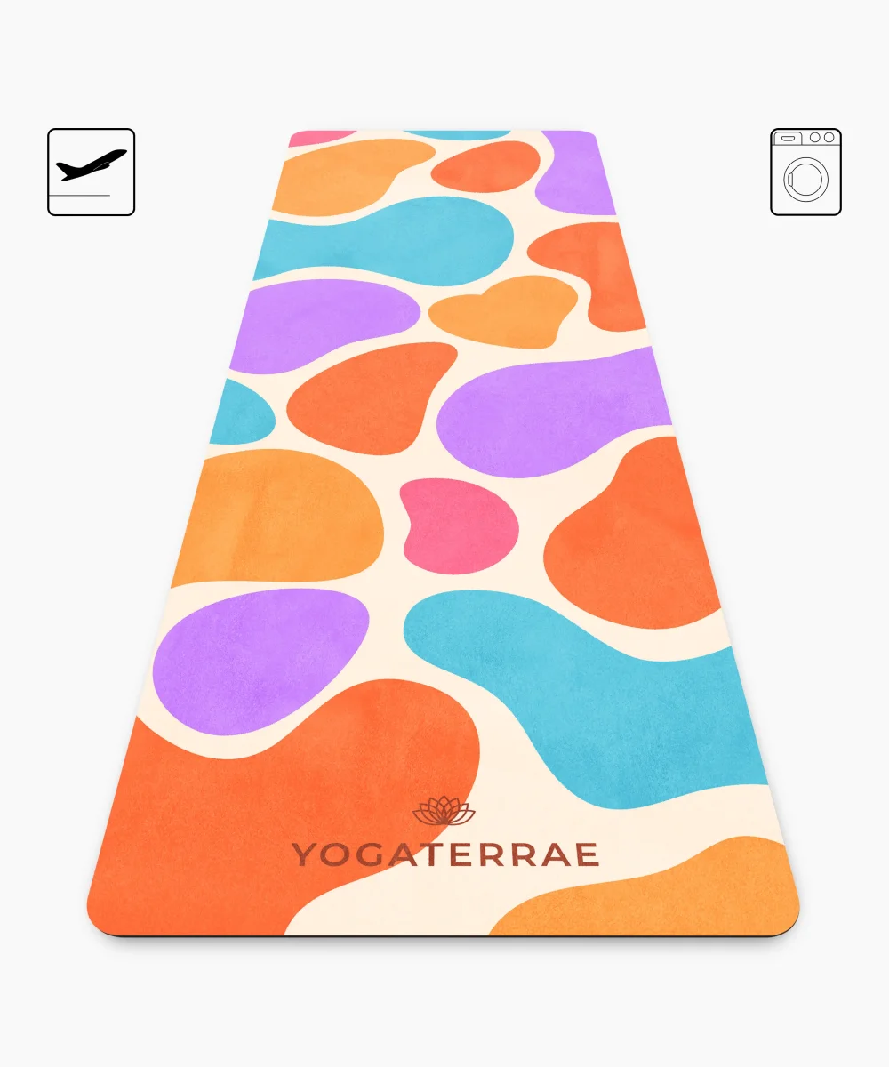 Le tapis de yoga MEXICO VOYAGE, en microfibre suédée douce et base en caoutchouc naturel de 1 mm, se plie et se transporte aisément. Léger et lavable en machine, il devient l’allié idéal de vos pratiques en voyage ou en studio. Ses teintes éclatantes, entre violet audacieux, turquoise intense et orange flamboyant, rappellent l’énergie des marchés mexicains et la chaleur des fêtes solaires. Un tapis pensé comme une vibration sensorielle, entre joie, liberté et intensité.