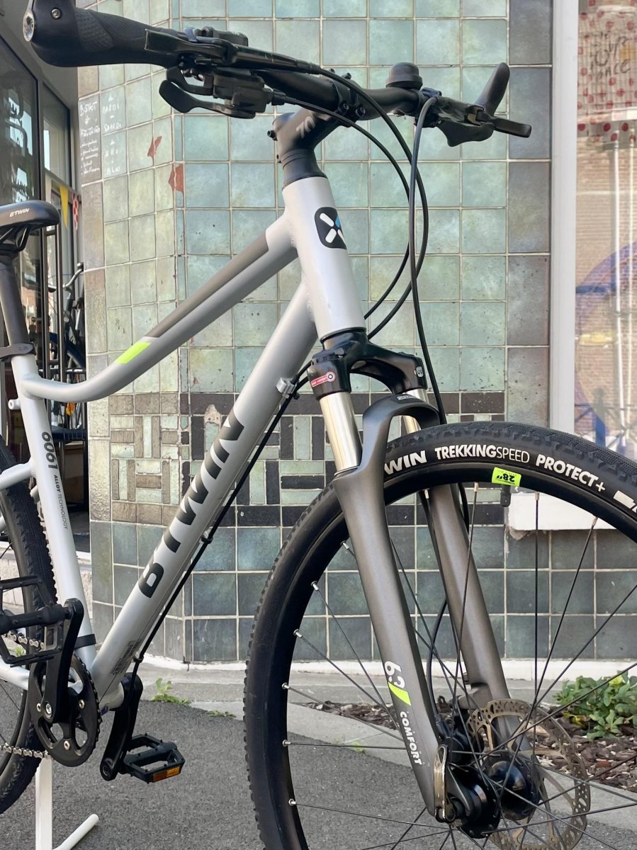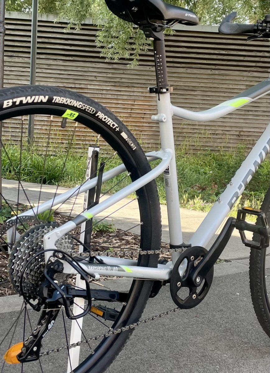 Cadre Aluminium Fourche suspendue lock-on Roues 622/19C double paroie Pneus 622/38 10 vitesses Freins à disque hydraulique Béquille latérale Prolongateur de cintre Sonnette