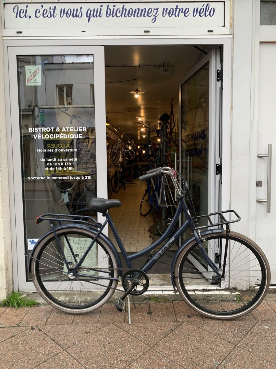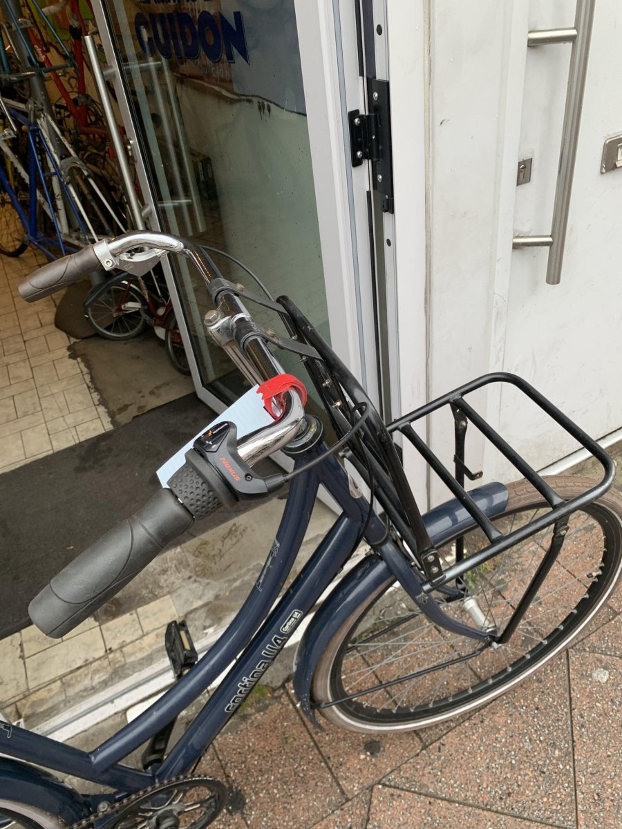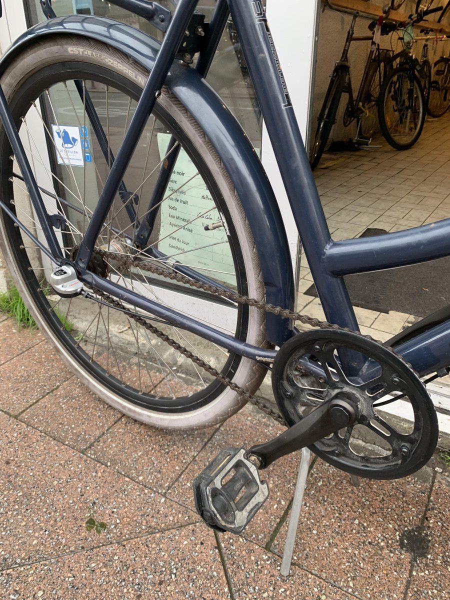 Vélo hollandais de la marque Cortina de couleur bleue. Système de vitesses dans le moyeu Nexus 3 vitesses et frein à rétropédalage.
