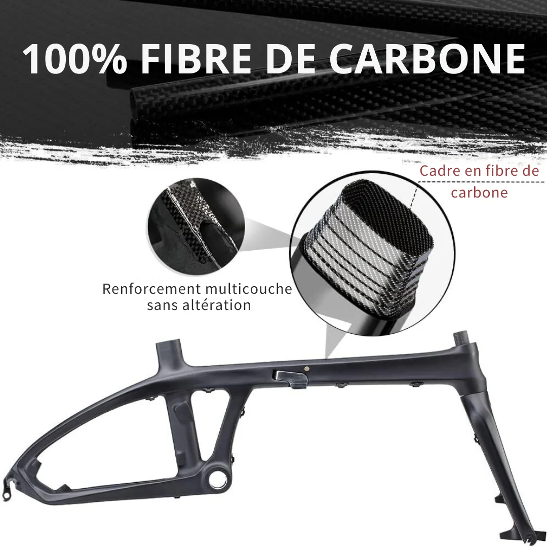| Taille cycliste recommandée : 148 à 180 cm | Cadre : Carbone T800 pliant – cadre intégré |
