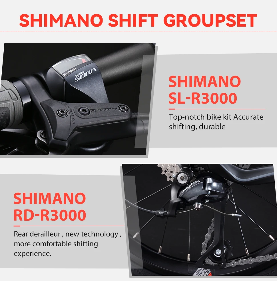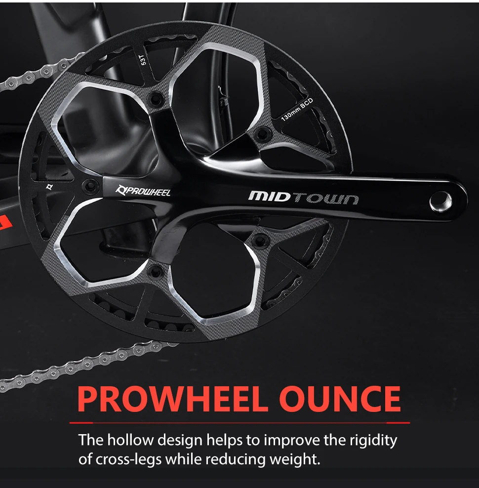 | Version 9 vitesses : Manettes : Shimano SORA SL-R3000 Dérailleur arrière : Shimano RD-R3000-GS Cassette : R42-9 – 11-25T Pédalier : Prowheel Midtown 53T – 170 mm Chaîne : KMC Z9 |