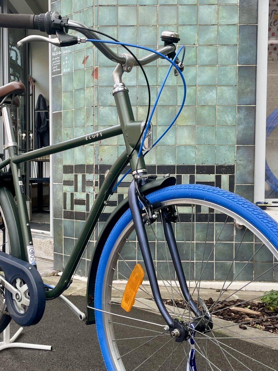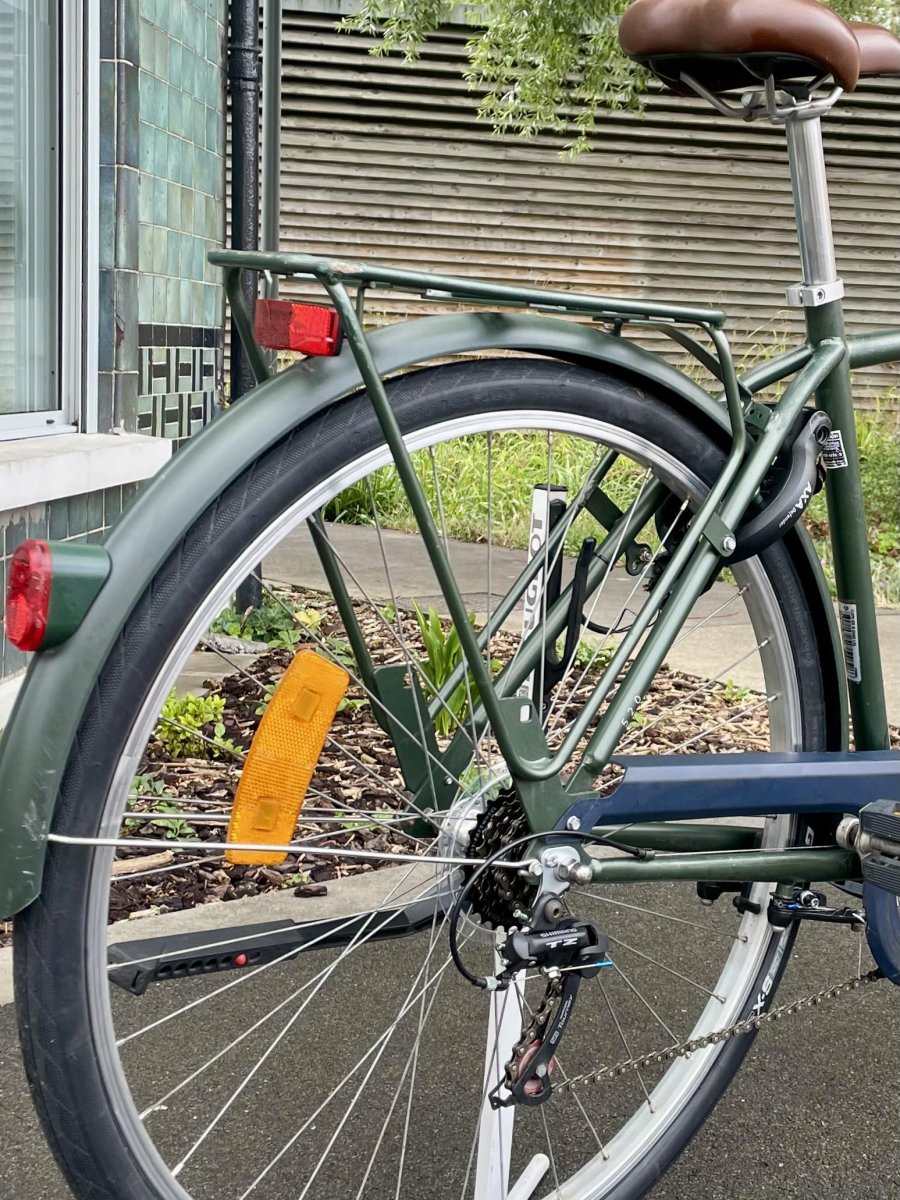 Cadre en acier Roues de 28″ avant et arrière en aluminium simple paroi Pneus 37-622 7 vitesses SHIMANO Revoshift Antivol de cadre AXA Defender Porte-bagages AR Eclairage par dynamo AV et AR ok Garde-boue AV et AR BĂ©quille latĂ©rale Carter de protection chaĂ®ne